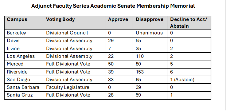 [Adjunct Faculty Series Academic Senate Membership Memorial Campus Voting Body Approve Disapprove Decline to Act/ Abstain Berkeley Divisional Council 0 Unanimous 0 Davis Divisional Assembly 29 55 0 Irvine Divisional Assembly 7 35 2 Los Angeles Divisional Assembly 22 110 2 Merced Full Divisional Vote 50 80 5 Riverside Full Divisional Vote 39 153 6 San Diego Divisional Assembly 33 65 1 (Abstain) Santa Barbara Faculty Legislature 0 39 0 Santa Cruz Full Divisional Vote 28 59 1]