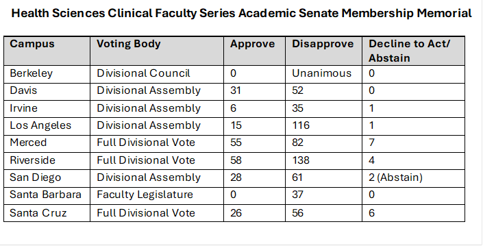 [Health Sciences Clinical Faculty Series Academic Senate Membership Memorial Campus Voting Body Approve Disapprove Decline to Act/ Abstain Berkeley Divisional Council 0 Unanimous 0 Davis Divisional Assembly 31 52 0 Irvine Divisional Assembly 6 35 1 Los Angeles Divisional Assembly 15 116 1 Merced Full Divisional Vote 55 82 7 Riverside Full Divisional Vote 58 138 4 San Diego Divisional Assembly 28 61 2 (Abstain) Santa Barbara Faculty Legislature 0 37 0 Santa Cruz Full Divisional Vote 26 56 6]