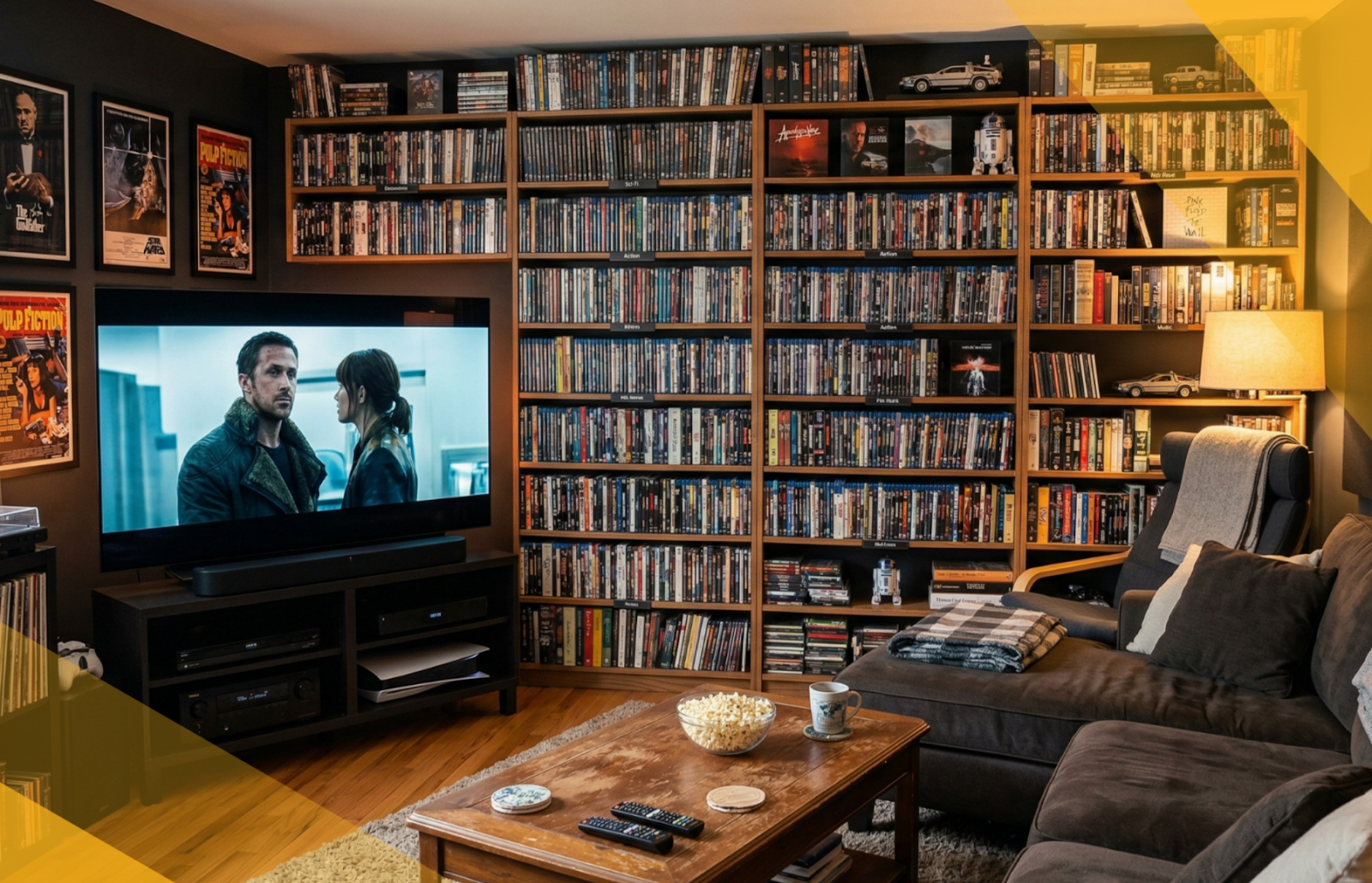 [image: A home media room with a large collection of media (DVDs, CDs,