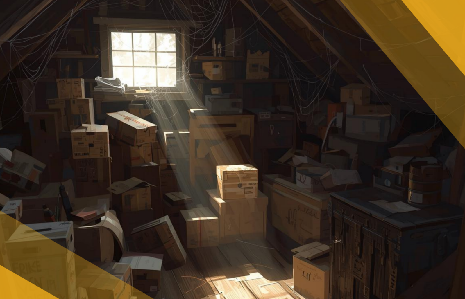 [image: An attic cluttered with boxes and items]