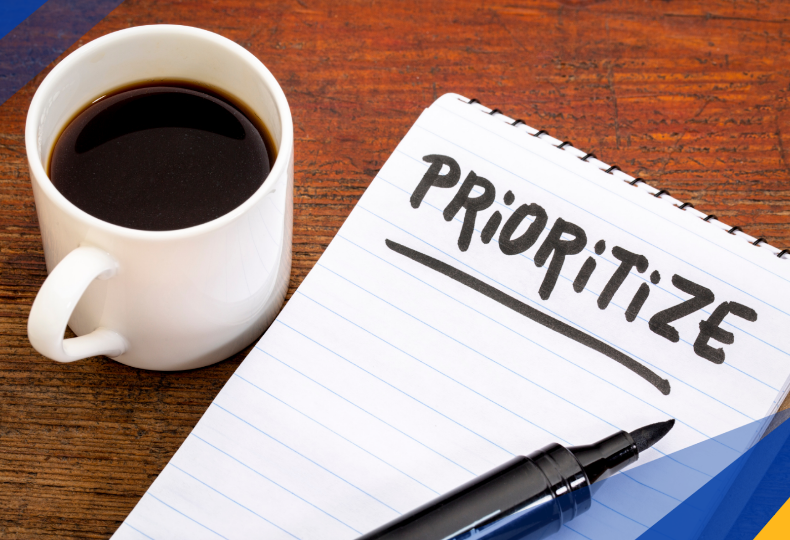 [image: Notepad that says 'prioritize' near a pen and coffee cup]
