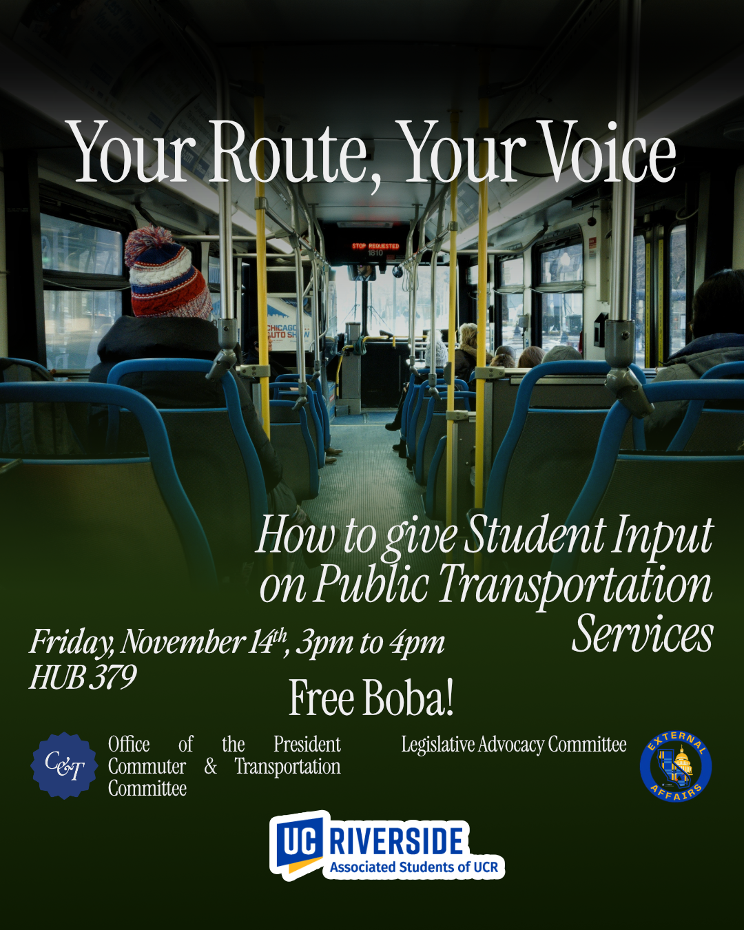 <https://events.ucr.edu/event/public-transit-advocacy?utm_campaign=widget&utm_medium=widget&utm_source=UC+Riverside&_gl=1*1j43v3*_ga*MTUxMTg5NDc5Ni4xNzU4NTUxNDAz*_ga_S8BZQKWST2*czE3NjI5NjY1NDckbzg5JGcxJHQxNzYyOTY2NTYxJGo0NiRsMCRoMA..*_gcl_au*MTM5NTExMjMyNi4xNzYyMzAwNzIx*_ga_Z1RGSBHBF7*czE3NjI5NjY1NDckbzc5JGcxJHQxNzYyOTY2NTYxJGo0NiRsMCRoMA..>,